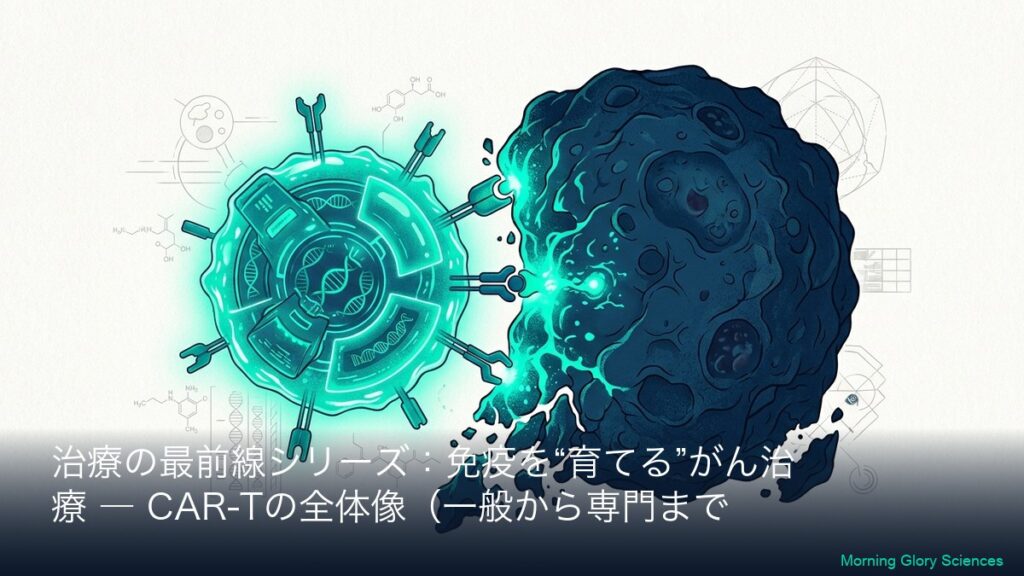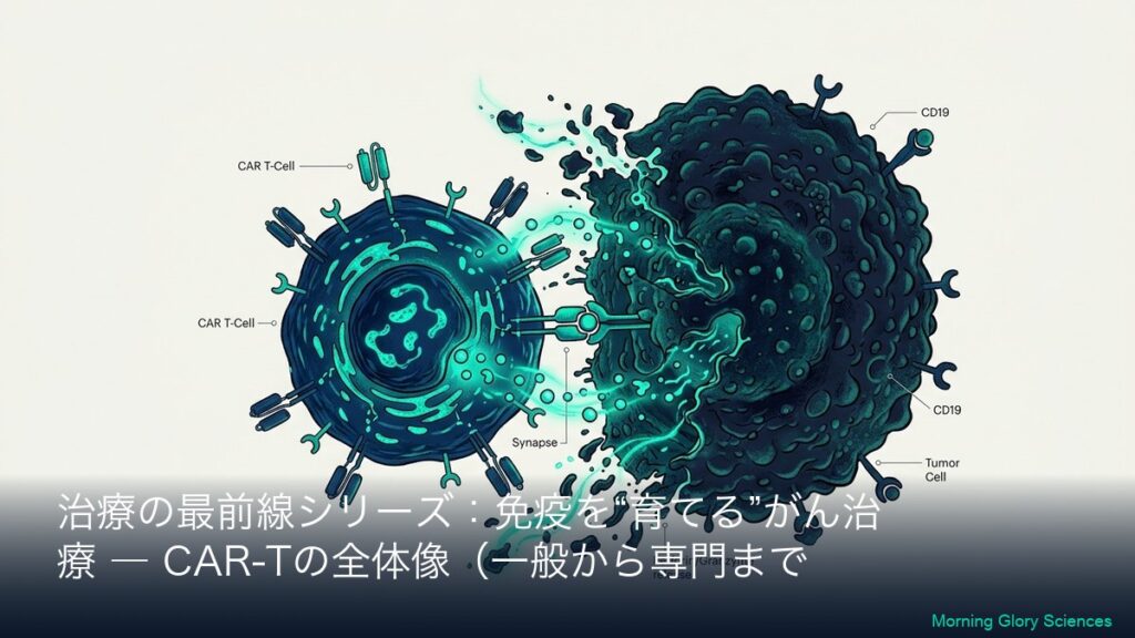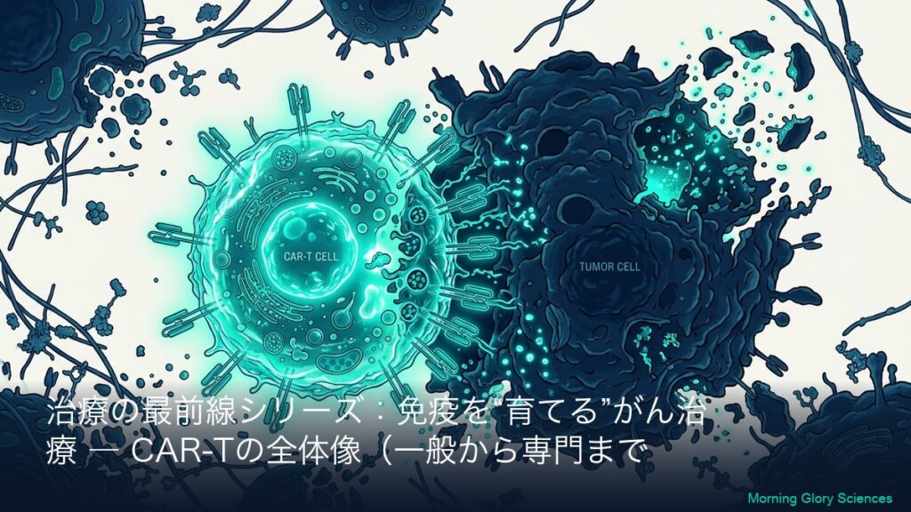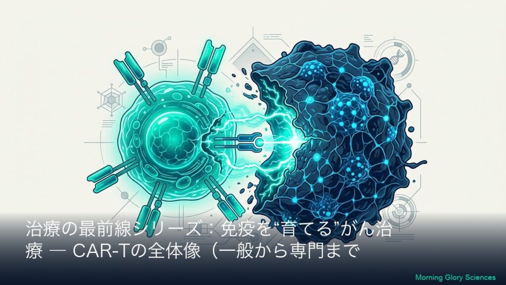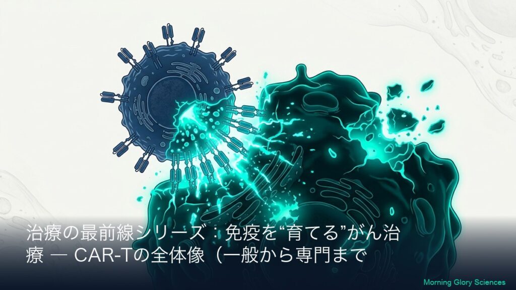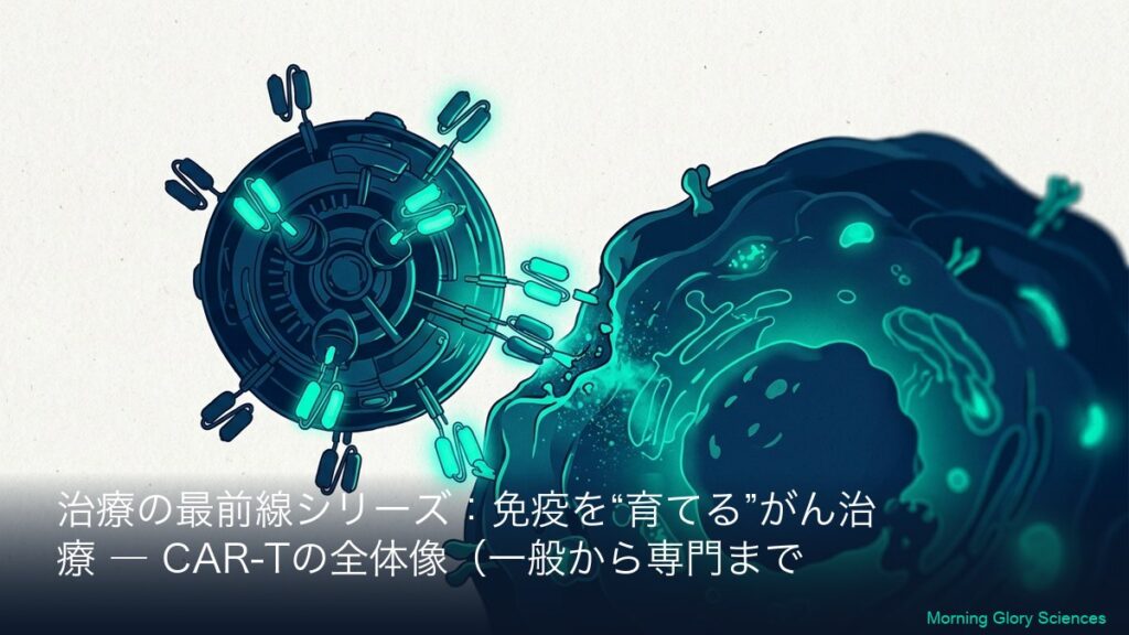 このシリーズについて(一般→専門の2層連結) 本シリーズは、CAR-T(カーティー)療法を「初めて聞いた方」でも理解できるように、まず全体像(一般向けA)を丁寧に説明し、その翌日以降に専門向け(B)で「社名・標的(CD19/BCMAなど)・CARの設計・臨床...