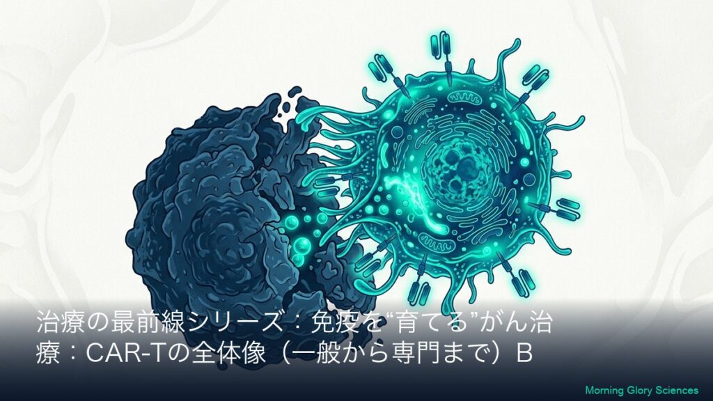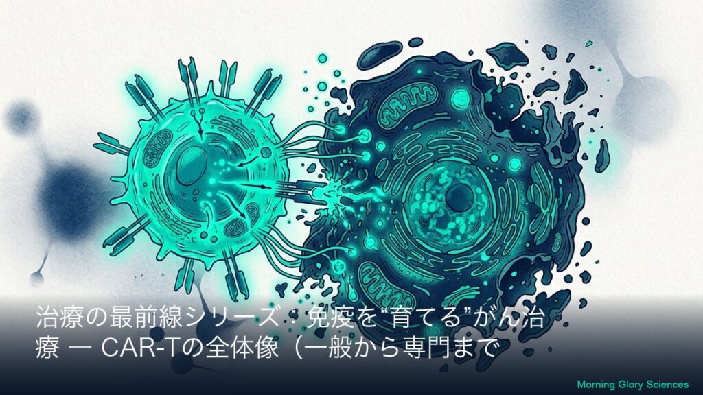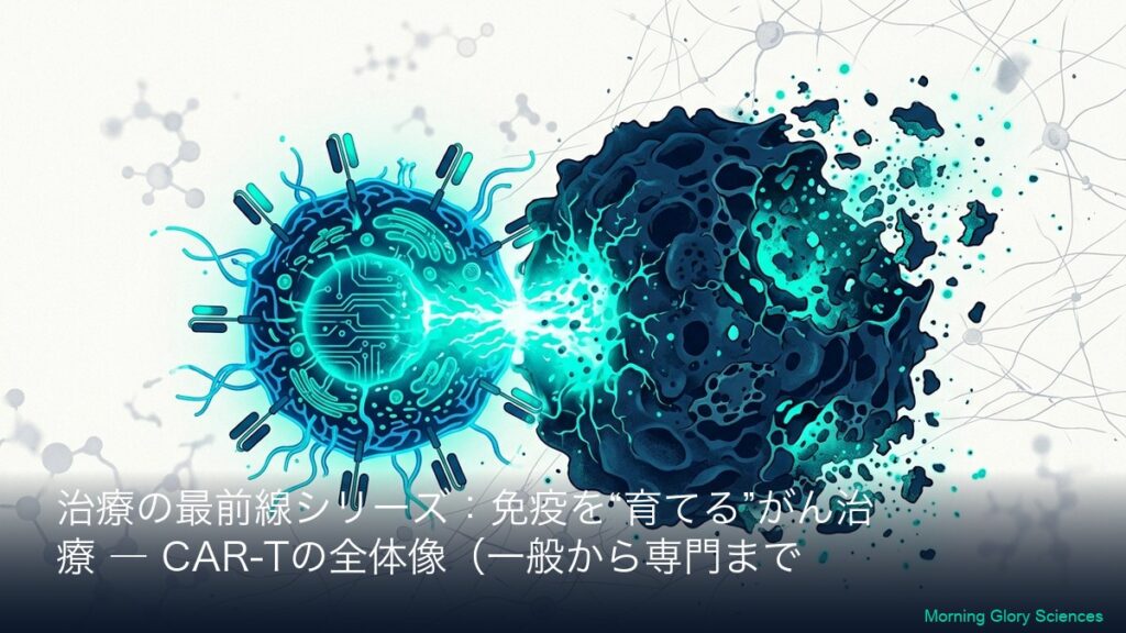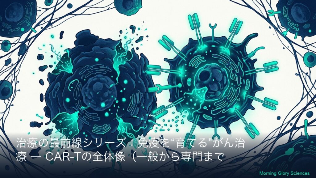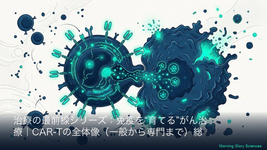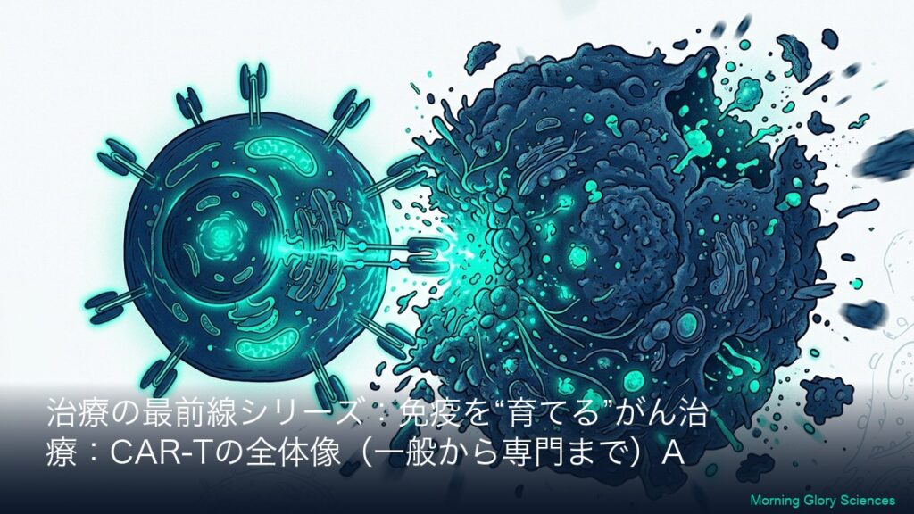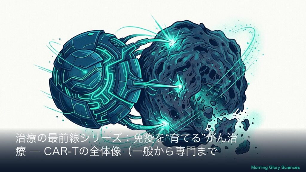 このシリーズについて(一般→専門の2層連結) 本シリーズは、CAR-T(カーティー)療法を「初めて聞いた方」でも理解できるように、まず全体像(一般向けA)を丁寧に説明し、その翌日以降に専門向け(B)で「社名・標的(CD19/BCMAなど)・CARの設計・臨床...