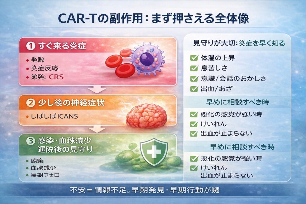 治療の最前線シリーズ:免疫を“育てる”がん治療 ― CAR-Tの全体像(一般から専門まで)|A2:CAR-Tの副作用を怖がらず理解する(何が起きる?何を見守る?)【一般向け】
