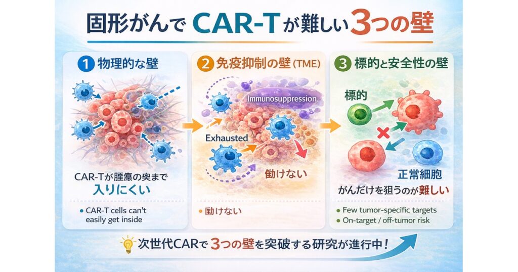 この回では、固形がんCAR-Tが難しい理由を、初心者でも追えるように 3つの壁に整理します。