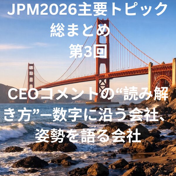 JPM2026では、各社CEOの発言が例年以上に注目されました。理由は単純で、プロ投資家は特許クリフや売上見通し、主要製品の集中度を把握しており、「言葉」と「数字(現実)」の整合を通じて、企業の意思決定(資本配分・BD・研究開発の優先順位)を読み取... -